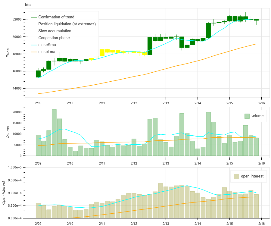 上圖最上方BTC 的價格走勢,中間是成交量、最下方是未平倉量、淺藍色是1 天均值,橘色是7 天均值。其中K 線的顏色代表當前的狀態,綠色是價格上升有成交量支持,紅色是在平倉,黃色是在緩慢累積倉位,黑色是擁擠狀態。