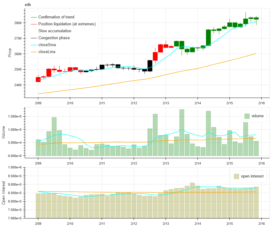 上圖最上方ETH 的價格走勢,中間是成交量、最下方是未平倉量、淺藍色是1 天平均值,橘色是7 天平均值。其中K 線的顏色代表當前的狀態,綠色是價格上升有成交量支持,紅色是在平倉,黃色是在緩慢累積倉位,黑色是擁擠狀態。