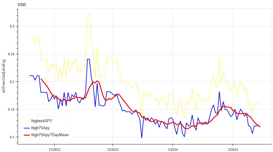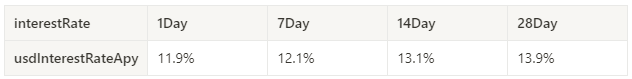 過去一週USD 放款年化收益平均為12.1% ,短期利率維持下降至12% 左右。