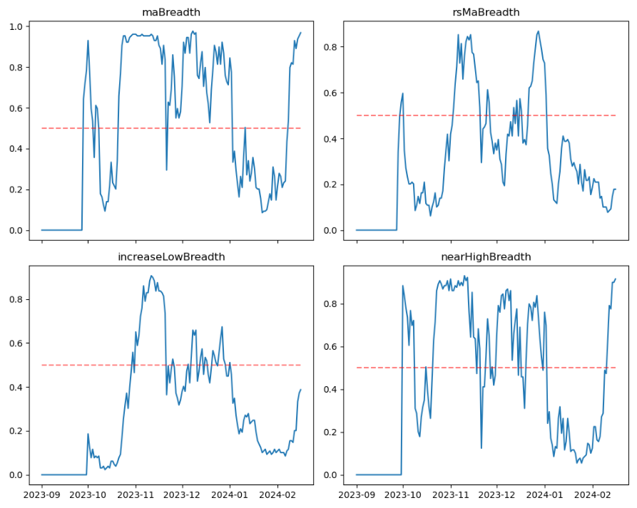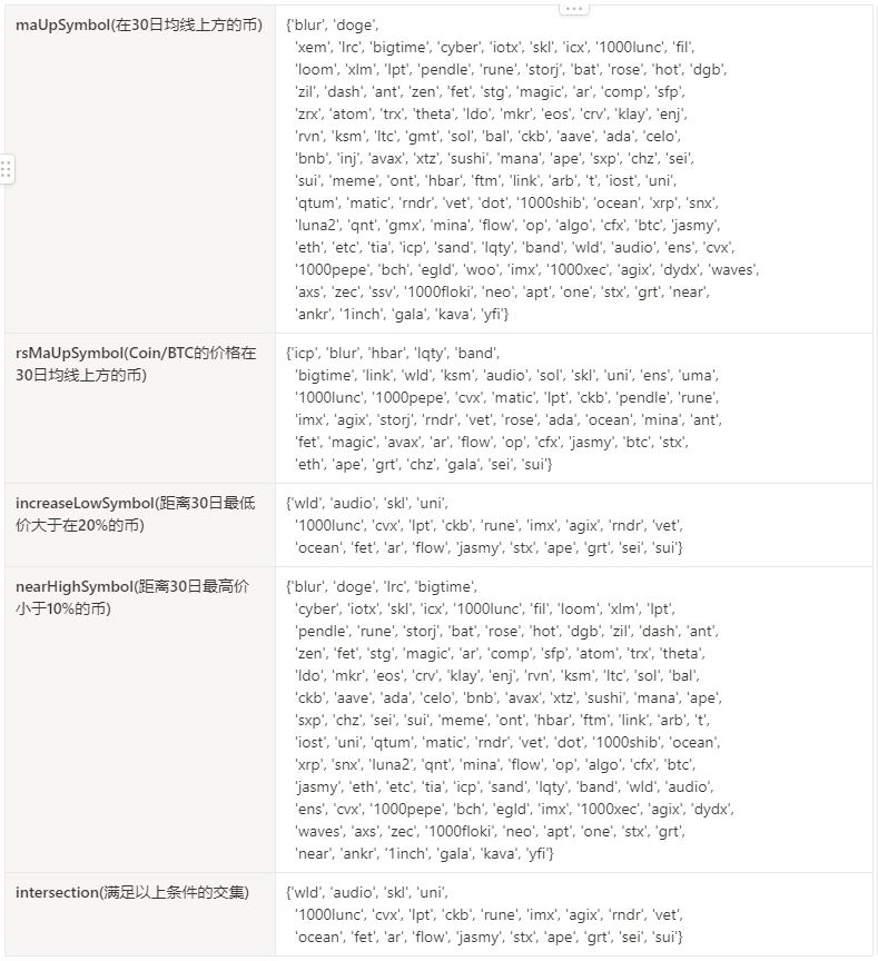 過去一週選中的129 個幣,價格在30 日均線上方的佔比為95% ,相對BTC 價格在30 日均線上方佔比為20% ,距離過去30 天最低價大於20% 的佔比為40% ,距離過去30 天最高價小於10% 的佔比為95% ,過去一周市場寬度指標全線上升,整體市場都回升至30 日均線上方並且接近最高價,較為強勢的幣有wld, audio , skl, uni, 1000 lunc, cvx, lpt, ckb, rune, imx, agix, rndr, vet, ocean , fet, ar, flow, jasmy, stx, ape, grt, sei, sui。