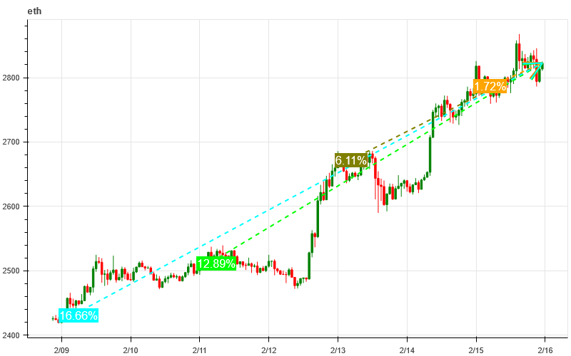 美國CPI 資料時間(北京時間2024.02.13 21: 30),公佈值( 3.1% )比預測值( 2.9% )高了0.2% ,BTC 與ETH 都在數據公佈後急速下跌-2.8% 後反彈,隨後在2024.02.14 突破新高,BTC 向上突破50000 大關,而ETH 向上突破2700 大關。