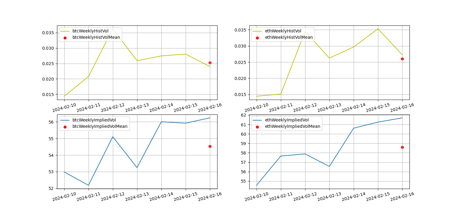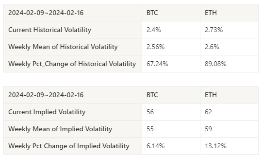 過去一週歷史波動率BTC 在2024.02.12 上漲時最大,而ETH 在2024.02.15 上漲時最大;隱含波動率都持續上升。