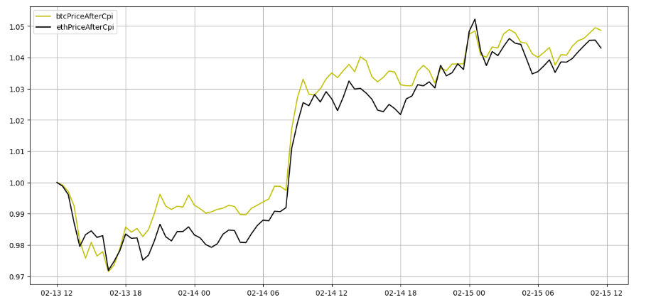 CPI 公佈後2 天的價格走勢,黃色線為BTC,黑色線為ETH。