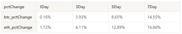 過去一週BTC 價格上漲14.55% ,ETH 價格上漲16.66% 。