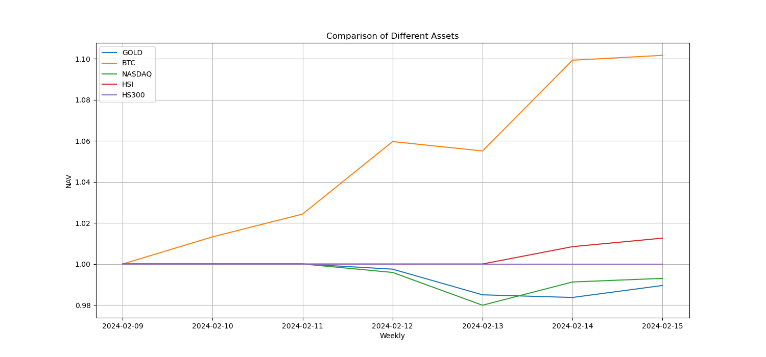 過去一週比特幣/黃金/納指/恆指/滬深300 中,比特幣最強勢,表現最差為黃金。