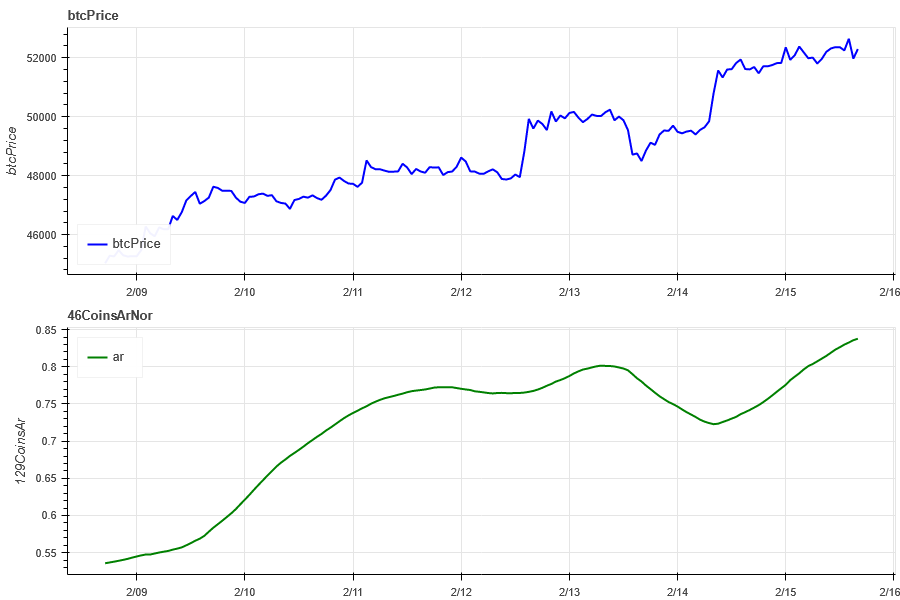 上圖藍色先為比特幣價格,綠線為[1000 floki, 1000 lunc, 1000 pepe, 1000 shib, 100 0x ec, 1inch, aave, ada , agix, algo, ankr, ant, ape, apt, arb, ar, astr, atom, audio, avax, axs, bal, band, bat, bch, bigtime, blur, bnb, btc, celo, cfx, chz, dockb , comp, crv, cvx, cyber, dash, dgb, dockb, comp, crv, cvx, cyber, dash, dgb, dockge, dot, dydx, egld, enj, ens, eos,etc, eth, fet, fil, flow, ftm, fxs, gala, gmt, gmx, grt, hbar , hot, icp, icx, imx, inj, iost, iotx, jasmy, kava, klay, ksm, ldo, link, loom, lpt, lqty, lrc, ltc, luna 2, magic, mana, matic, meme, mina, mkr, near, neo, ocean, one, ont, op, pendle , qnt, qtum, rndr, rose, rune , rvn, sand, sei, sfp, skl, snx, sol, ssv, stg, storj, stx, sui, sushi, sxp, theta, tia, trx, t, uma, uni , vet, waves, wld, woo, xem , xlm, xmr, xrp, xtz, yfi, zec, zen, zil, zrx]整體的相關性