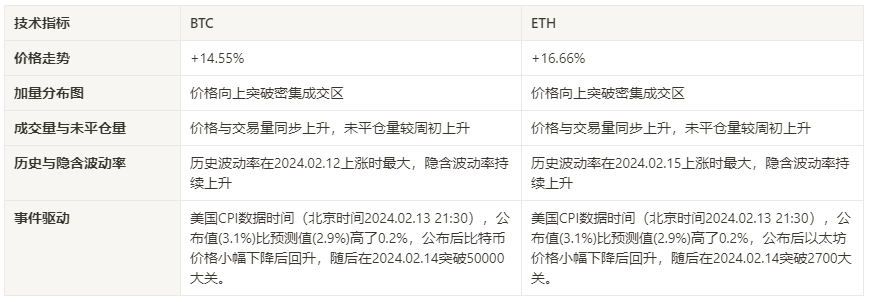 本週行情BTC 與ETH 整體大幅上升,兩者的成交量、未平倉量、歷史波動率與隱含波動率都較周初上升,市場持續維持上升趨勢;資金費率由於合約槓桿的情緒低因此收益率也維持在低位;129 個幣安市場寬度指標全線上升,整體市場都回升至30 日均線上方並且接近最高價,較為強勢的幣有wld, audio, skl, uni, 1000 lunc, cvx , lpt, ckb, rune, imx, agix, rndr, vet, ocean, fet, ar , flow, jasmy, stx, ape, grt, sei, sui;事件方面,美國CPI 資料時間(北京時間2024.02.13 21: 30),公佈值( 3.1% )比預測值( 2.9% )高了0.2% ,公佈後比特幣價格小幅下降後回升,隨後在2024.02.14 BTC 突破50000 大關,而ETH 突破2700 大關。