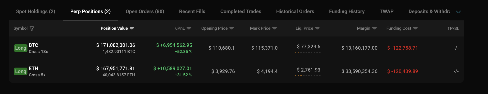 HyperBot數據顯示, 「10.11 至今勝率100%巨鯨」目前持有的13 倍BTC 多單和5 倍ETH 多單已浮盈約1754 萬美元,且暫時仍未止盈,三小時前該巨鯨甚至還追加建倉了1868 枚ETH 多單。目前,該巨鯨的持倉總價值約3.39 億美元,其中BTC 多單價值約1.71 億美元,開倉價為110,680 美元;ETH 多單價值約1.68 億美元,開倉價為3,929 美元。