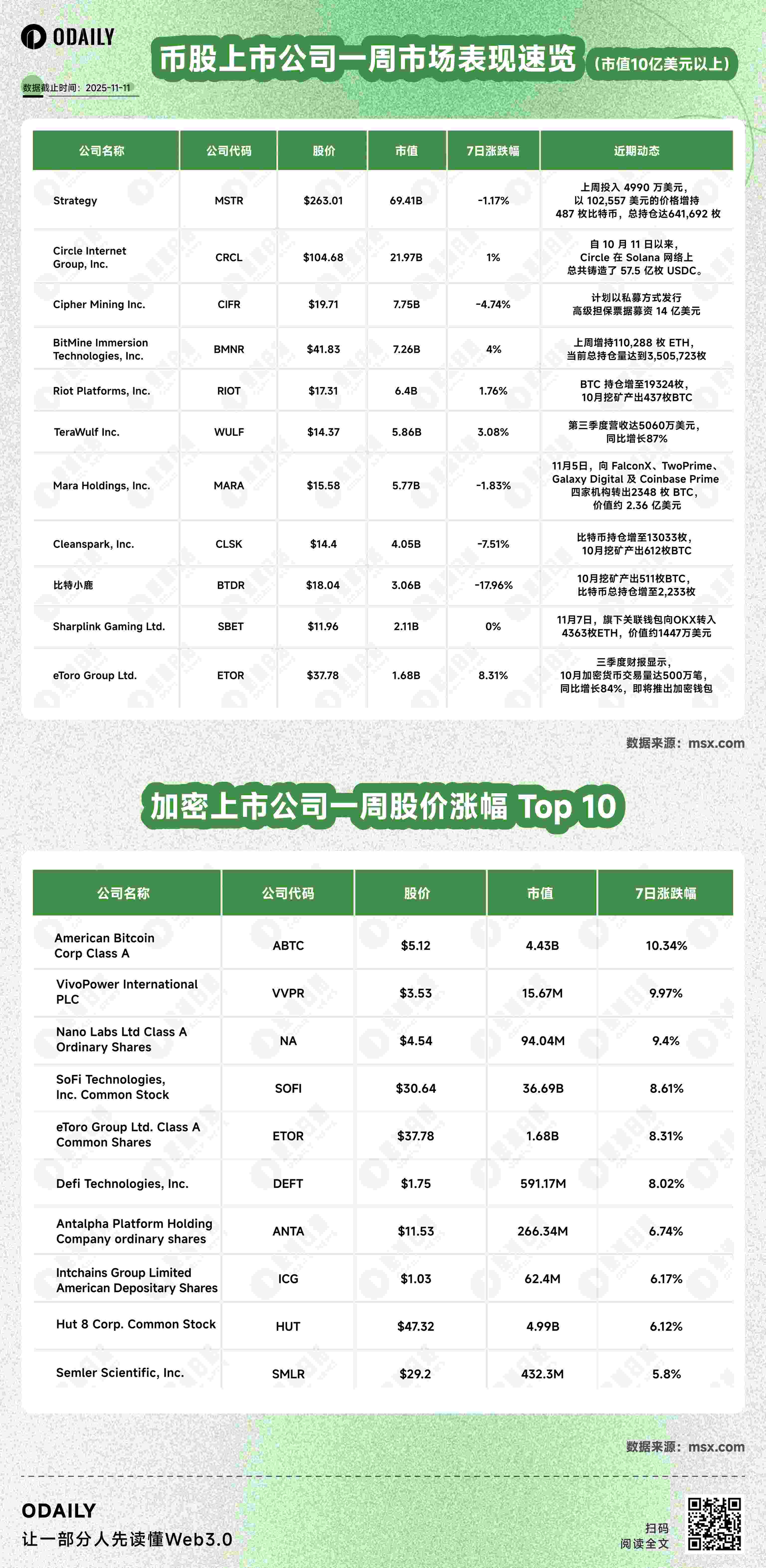 編者按:隨著比特幣一度跌破10萬美元大關,加密市場迎來了繼「10·11大跌」之後的又一波恐慌期;與此同時,或受名人效應、市場需求以及概念帶動等利好影響,隱私賽道、存儲賽道等老牌項目代幣市場仍然短暫下跌了自己的高光時刻,但加密貨幣。但市場下行期間,Coinbase、Robinhood 仍以預測市場、發射平台等增量業務引發市場較高預期,股價波動相對較小。後續建議讀者註意龍頭企業的股價走勢,同時結合市場大盤適度停損。以下為Odaily 星球日報總結整理的上週幣股市場信息,所有美股數據均來自msx.com 。