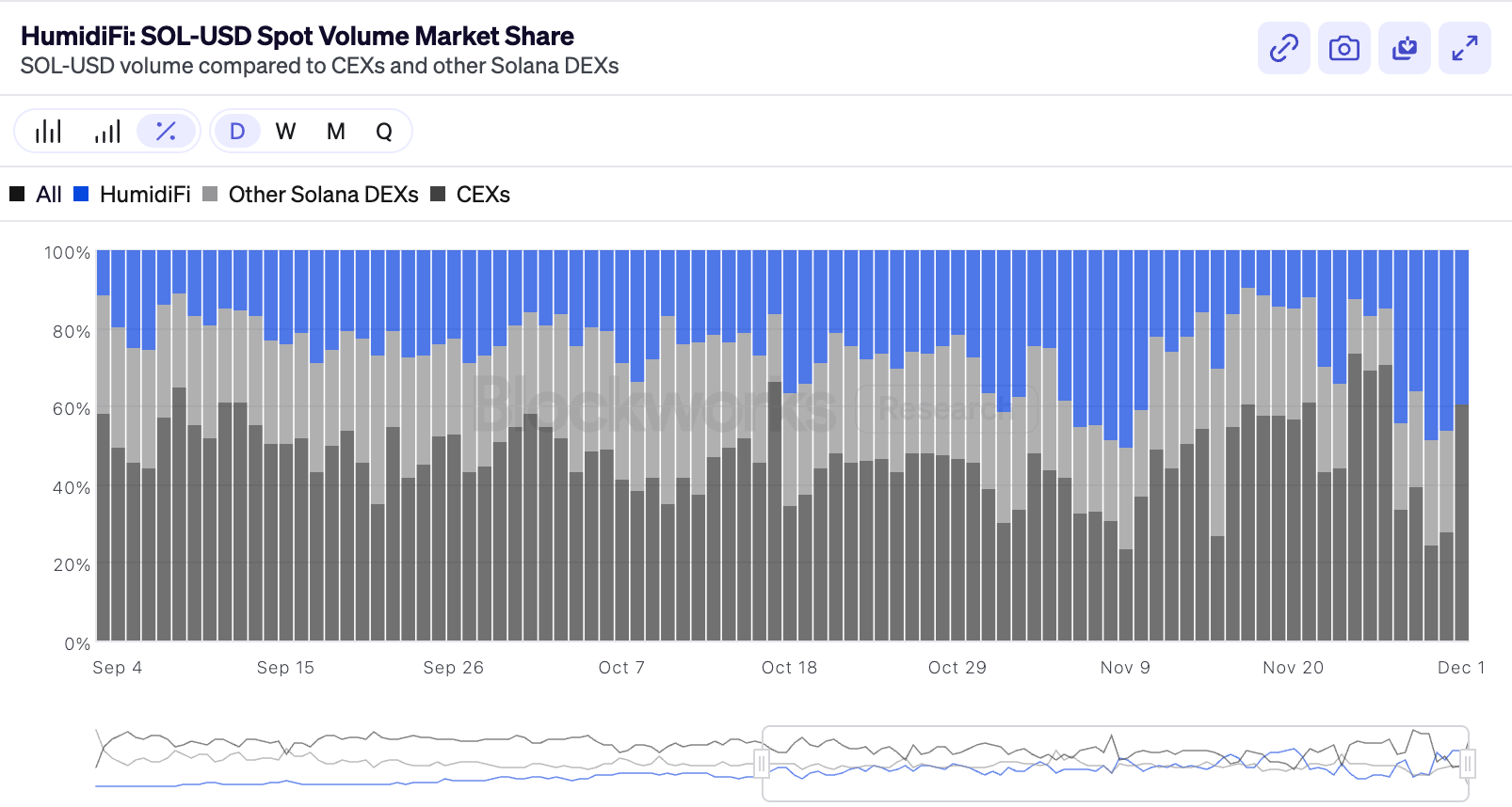 目前, HumidiFi 已成為了Solana 鏈上實際交易量最大的去中心化交易所(DEX) ,日均處理交易額超10 億美元—— 約佔Solana 全部現貨DEX 交易活動的35%,Solana 每日收入的約4% 都來自這些交易。