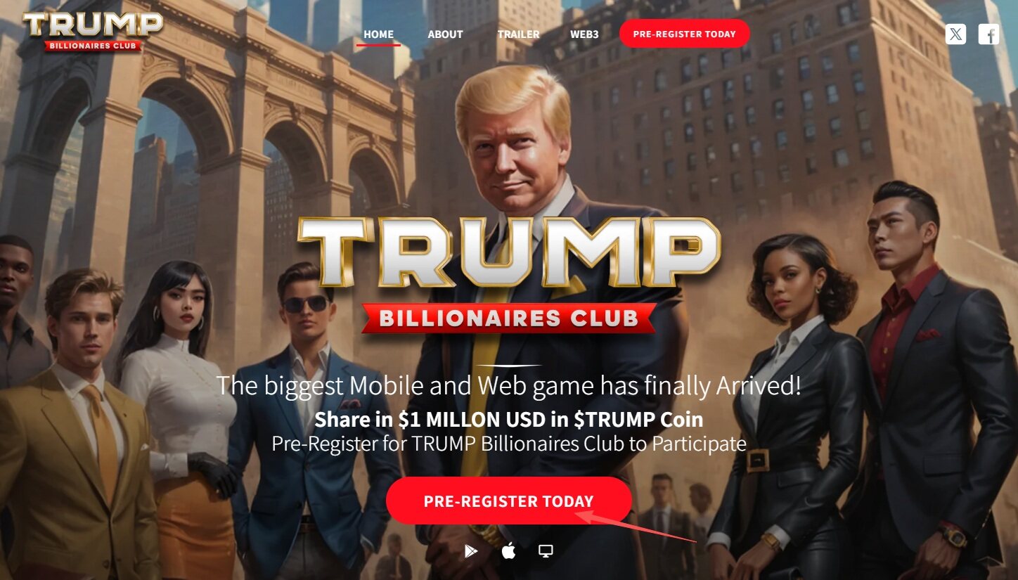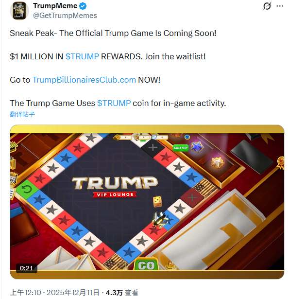 12 月11 日,TRUMP Meme 代幣團隊在X 平台發文表示,將推出一款面向川普粉絲的手機遊戲Trump Billionaires Club,目前已上線預告頁面並開放候補名單。專案方表示,遊戲將設定TRUMP 代幣相關獎勵機制,參與用戶或可獲得價值約100 萬美元的獎勵。