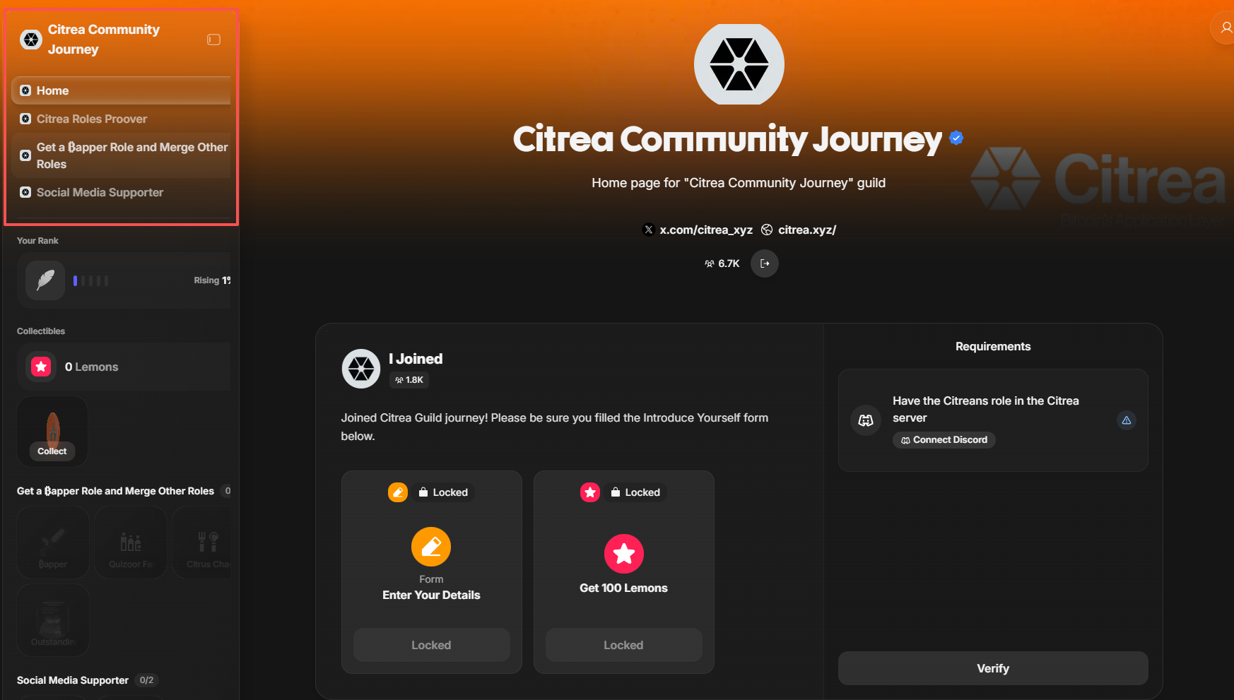 進入互動網站(連結: https://guild.xyz/citrea-community-journey/ )並登入個人帳號,完成任務需滿足的條件包括Discord 指定身分、測試網用戶、NFT 持有者。