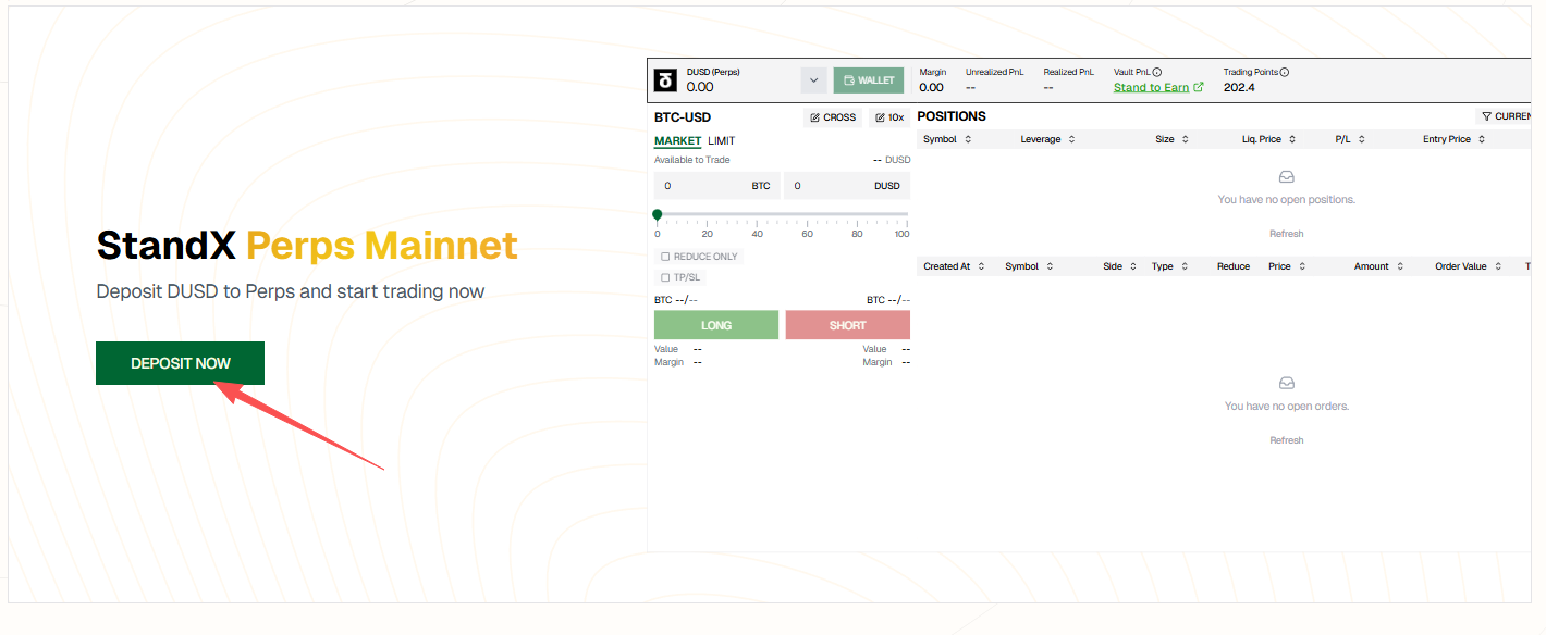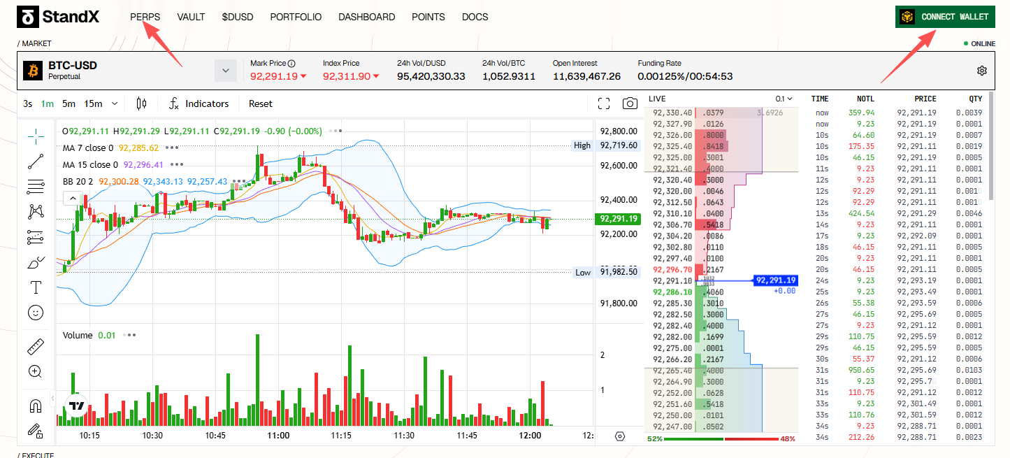 STEP 1. 進入互動網站(連結: https://standx.com/ ),連接Web3 錢包後點擊上方“PERPS”,進行鏈上合約交易介面。