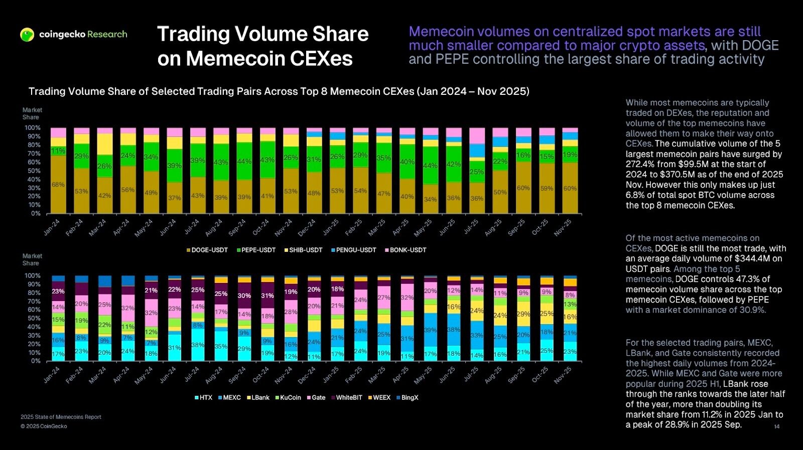 在這份報告中,CoinGecko 首次系統性地梳理了各大CEX 在Meme 交易中的市場份額變化,其中最引人注目的名字之一,就是成立於2015 年的LBank:其在主流Meme 現貨交易對中的市場份額,從2025 年1 月的11.2% 提升至9 月的市佔率現貨交易量穩定位居CEX 前三名。