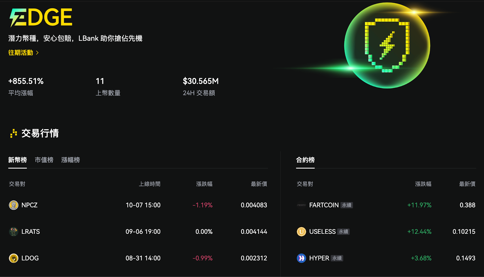 - 100x Gem專區– LBANK EDGE:發掘高潛力資產。 2025年LBank推出了全新的高倍收益代幣專區「LBank EDGE」。憑藉LBank作為全球衍生性商品大所的深厚流動性,EDGE專區旨在發掘高潛力的「百倍寶石」項目,並提供多層次的用戶保護。平台利用去中心化交易資料和AI智慧分析篩選出有強勁成長潛力的資產,在專屬的「100x Gem Zone」中上線,並為每個新幣提供獨立的USDT交易對以確保充足流動性。更創新的是,EDGE為用戶設定了下檔保護機制:在推廣期間內,凡在EDGE專區淨虧損的用戶,可自動獲得100美元等值USDT的補償,該補貼由一個500萬美元規模的生態基金提供支持。這項「交易包賠」措施在業界屬首創,大幅降低了用戶參與早期專案的風險。實際效果上,EDGE專區自推出以來戰績斐然-截至12/16已上線11檔代幣,平均漲幅超過8.5倍,最高漲幅達207倍。如此亮眼的回報率證明EDGE為用戶捕捉早期紅利提供了有效管道,也為LBank吸引了大批偏好高風險高回報的交易者。