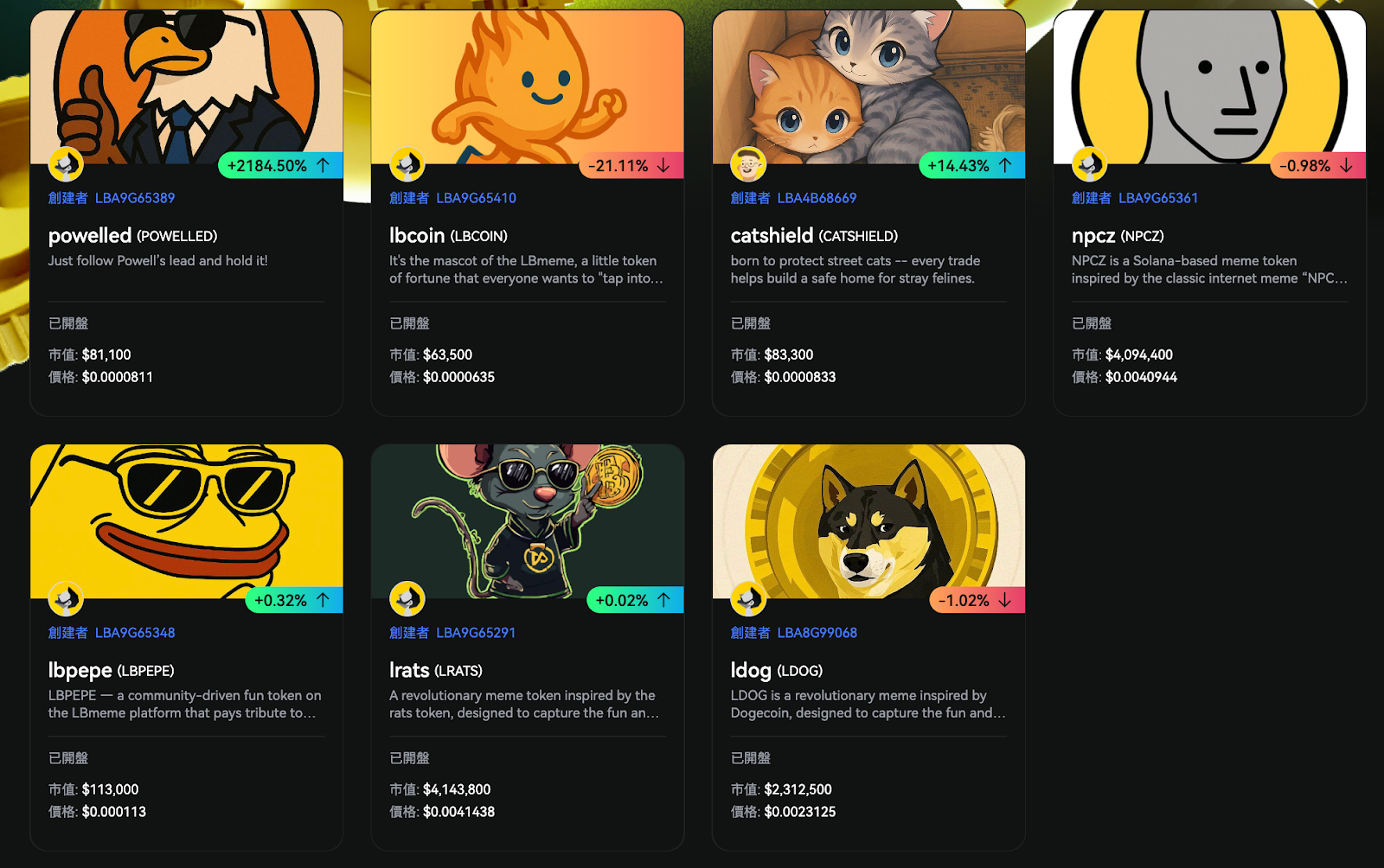 - LBmeme Launch首發平台:創新IDO模式。 為了進一步佈局Meme生態,LBank在2025年同步上線「Meme幣發行平台」LBmeme Launch。它採用了一種基於AMM的IDO新模式,簡化了Meme幣的發行流程,使用戶更容易創建和參與Meme專案。 LBmeme Launch最大的特色在於引入了全額退款機制:若用戶參與首發的Meme代幣表現不佳,可依規則獲得資金退還。這項機制打消了投資者對踩雷歸零的顧慮,鼓勵更多人參與新Meme幣首發。 LBmeme Launch自上線以來幫助多個Meme專案實現了引人注目的漲幅。例如,透過該平台首發的「拉狗幣」(LDOG)上線後最高漲幅達12129%,另一項目LRATS最高漲幅近5942%,為早期參與者帶來了成百上千倍的收益。這些成功案例使LBmeme Launch迅速建立口碑,一方面吸引優質新項目選擇在LBank首發,另一方面鞏固了LBank在Meme幣首發領域的領先地位。