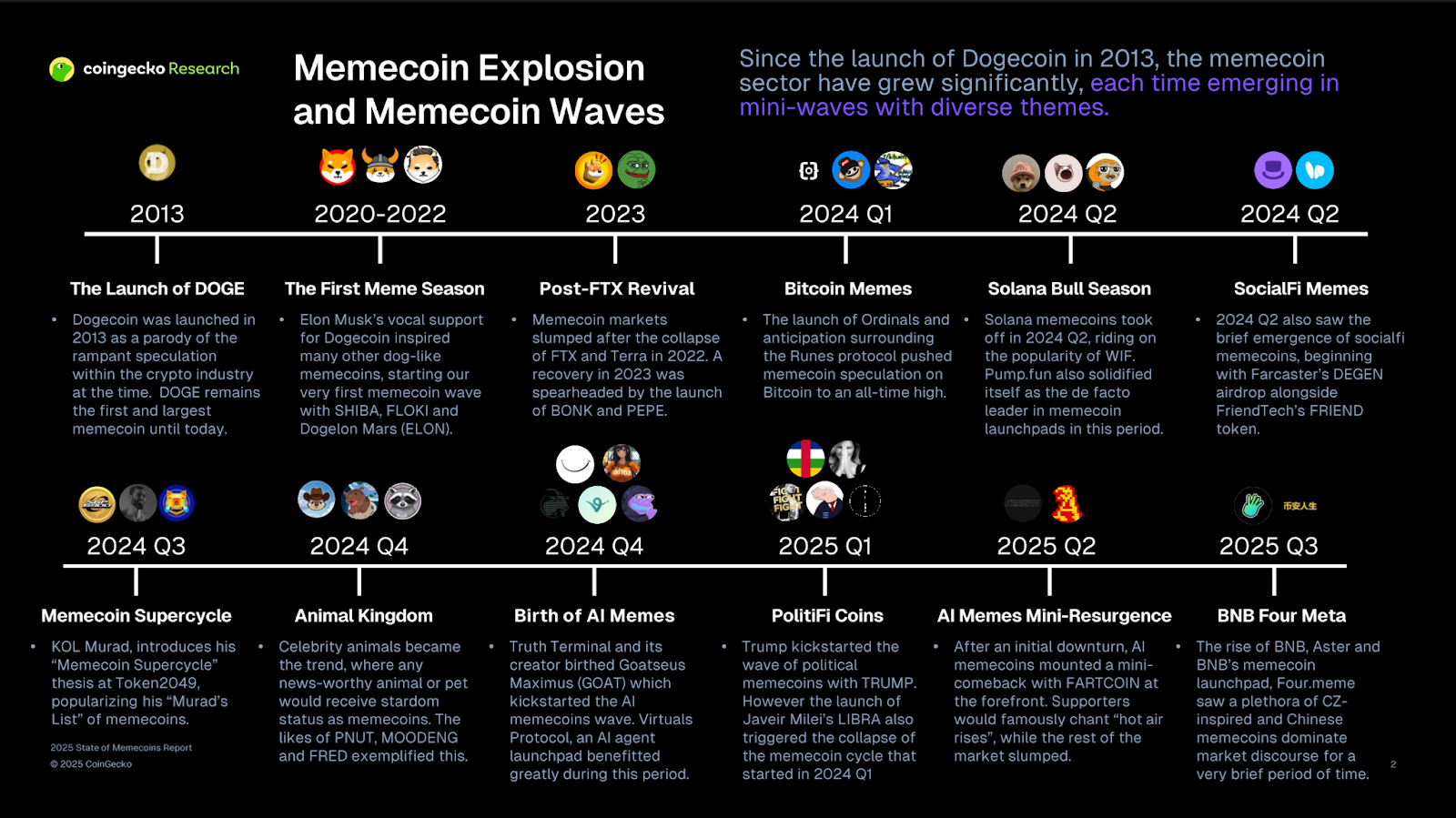 過去兩年,加密市場的敘事重心一次次被Memecoins 改寫:從2023 年的PEPE、SLERF,到2024–2025 年在Solana、Base 等公鏈上的“狗狗宇宙”和“青蛙宇宙”,Meme 資產不再只是邊緣文化,而是實實在在主導了情緒、流動性與新增資金的情緒、流動性與新增資金的情緒。最新發布的《2025 State of Memecoins Report》顯示,Meme 已成為整個現貨交易生態中最具話題性的板塊之一,頭部Meme 在多個季度裡貢獻了CEX 現貨成交量的顯著比例,這一趨勢在2025 年仍在持續放大。