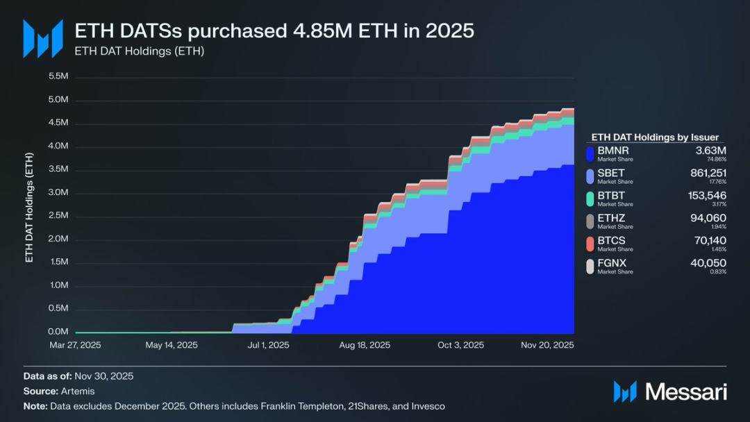2025 年,以太坊財庫公司累計增持以太坊480 萬枚,佔其總供應量的4%,對以太坊的價格產生了顯著影響。其中表現最突出的,是Tom Lee 領導的Bitmine(股票代號BMNR)。這家原本主要經營比特幣挖礦的企業,於2025 年7 月開始將儲備資金及資本逐步轉換為以太坊。 7 月至11 月期間,Bitmine 累計購入363 萬枚以太坊,以75% 的持股佔比穩居以太坊財庫公司市場的龍頭地位。