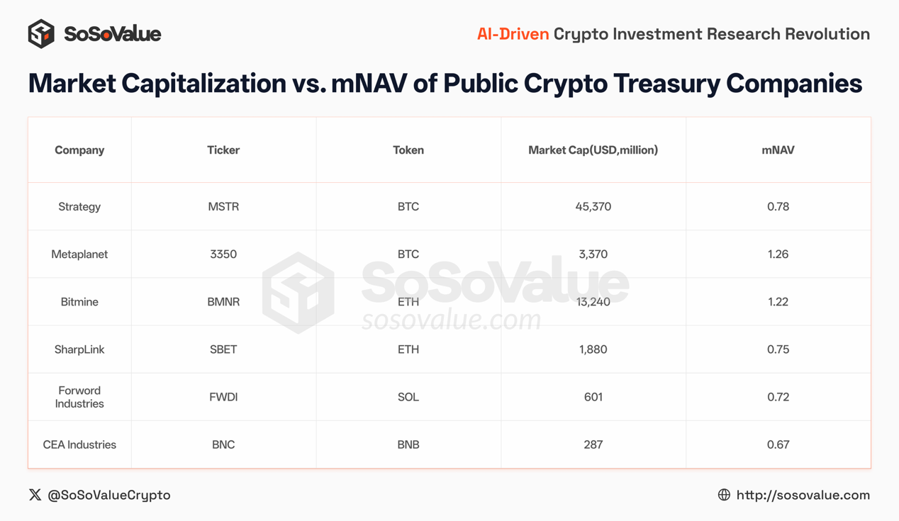 圖5:上市加密資產儲備公司的市值與mNAV 比較(資料來源:SoSoValue)