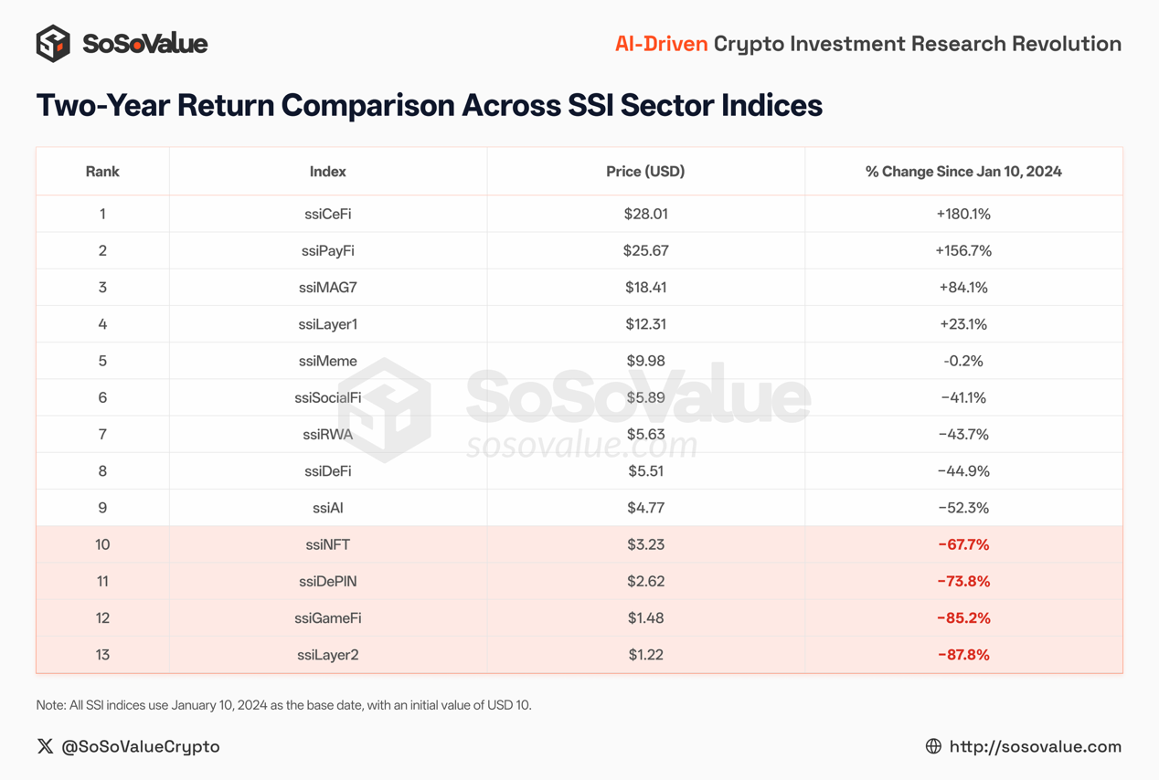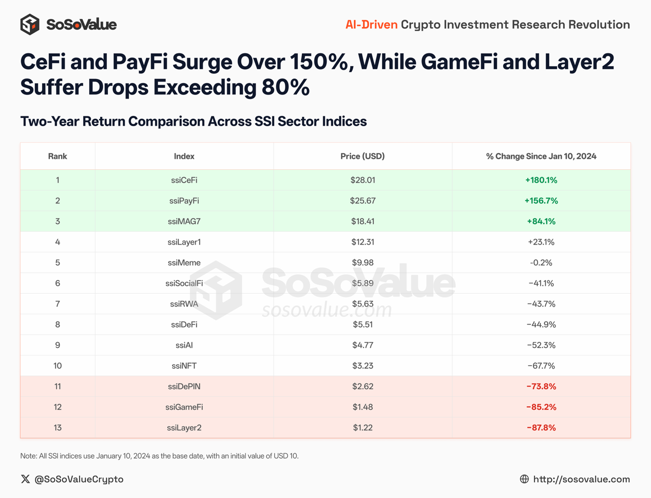 圖1:SSI 加密指數兩年期報酬出現極致分化:CeFi、PayFi 漲幅超150%,GameFi、Layer2 回檔逾80%(資料來源:SoSoValue)