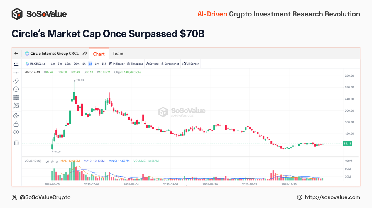Circle 的上市反映了傳統資金對「合規加密曝險」的強需求。公開交易數據裡,CRCL 在2025 年6 月的高點達到298.99 美元,對應市值705 億美元。