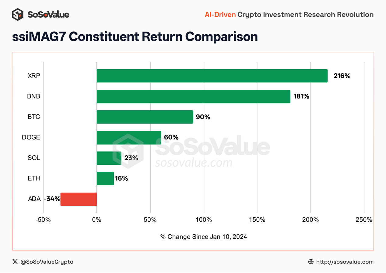 圖3:MAG7成分回報率極度分化:合規與壟斷紅利資產大幅跑贏,公鏈敘事失去超額收益(資料來源:SoSoValue)