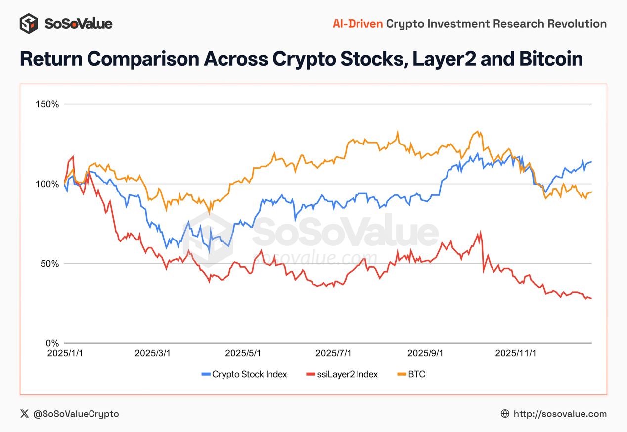 圖4:風險資金外移至美股:加密概念股走強,鏈上資產如Layer2則持續失血(資料來源:SoSoValue)