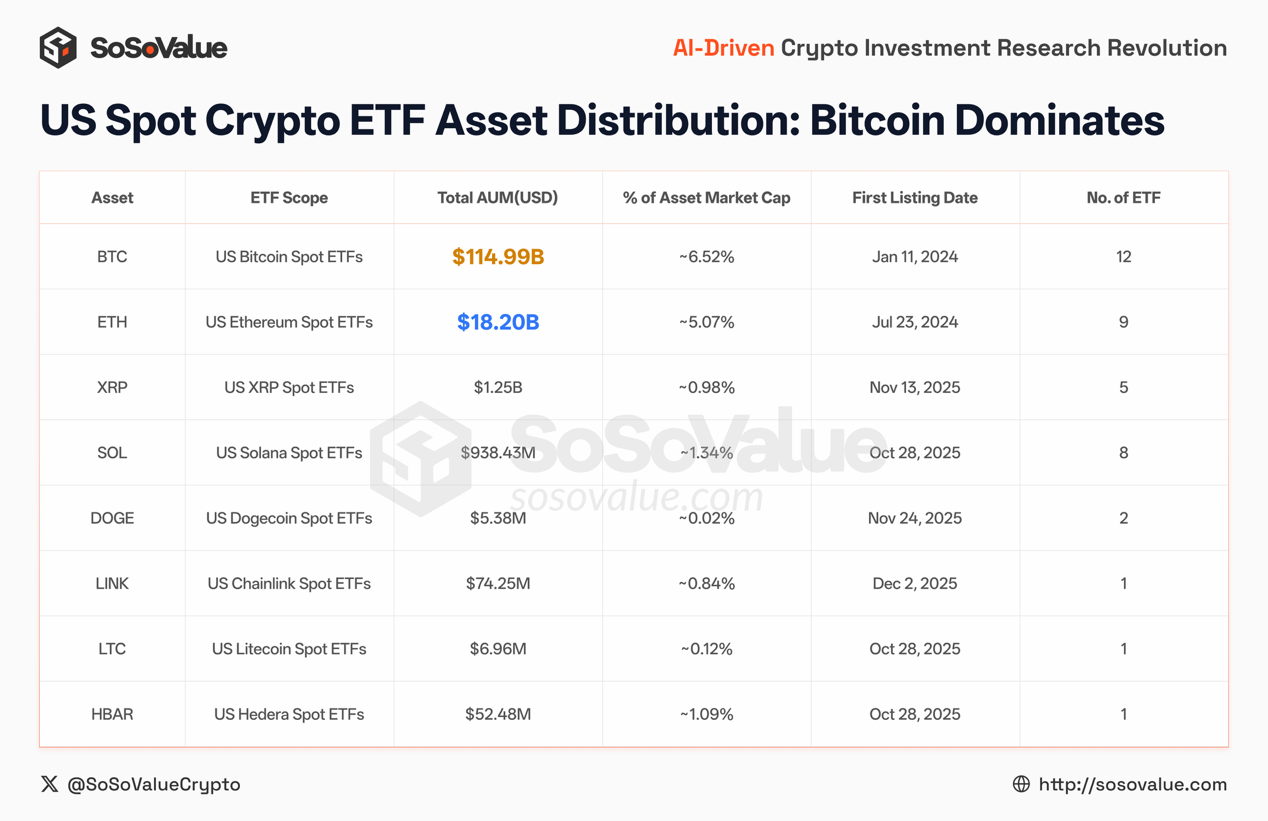 圖2:合規資金偏好清晰:比特幣獨占主導,其它資產未獲規模配置美國現貨加密ETF 資產分佈,資料來源:SoSoValue)