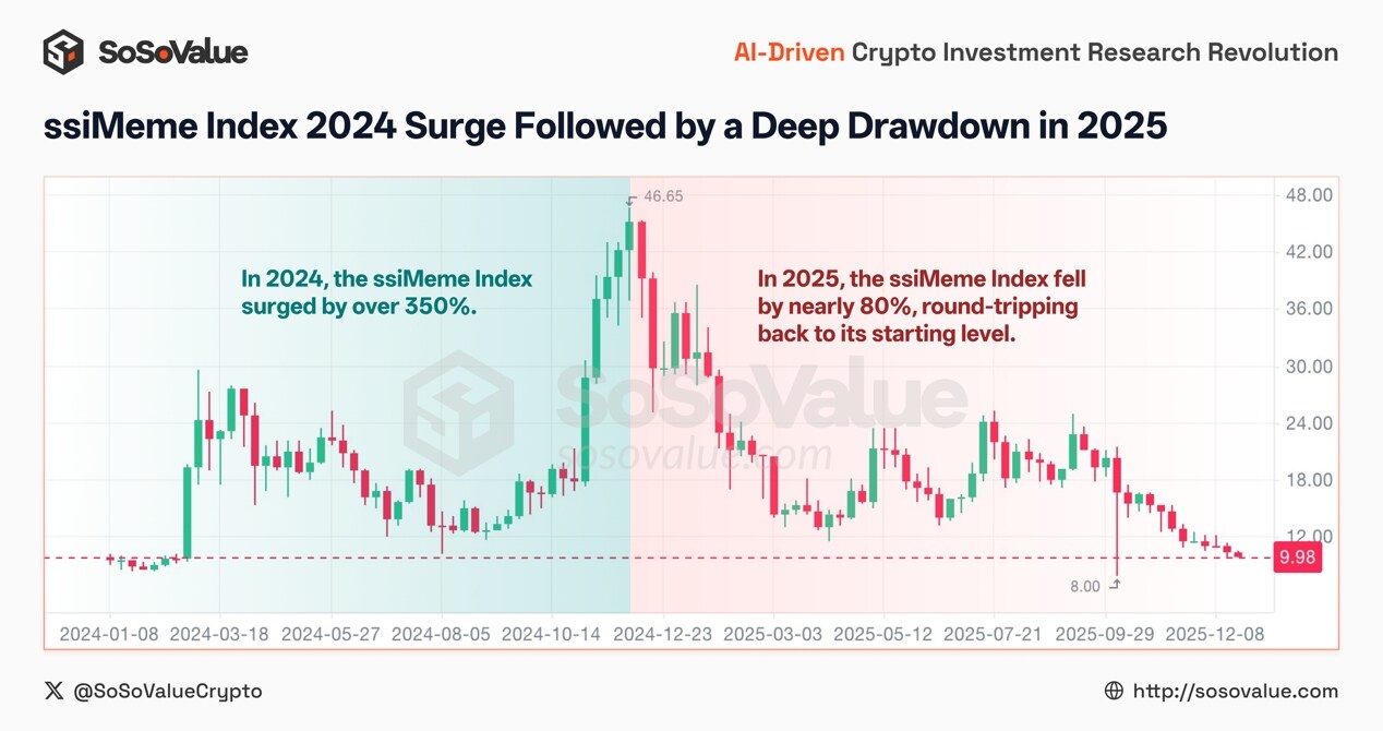 SoSoValue SSI Meme 指數在2025 年底的讀數看似印證了這一點: 9.98 美元。