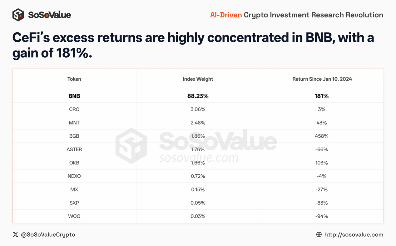 圖9:CeFi 的超額報酬高度集中在BNB,漲幅181%。 (資料來源:SoSoValue)