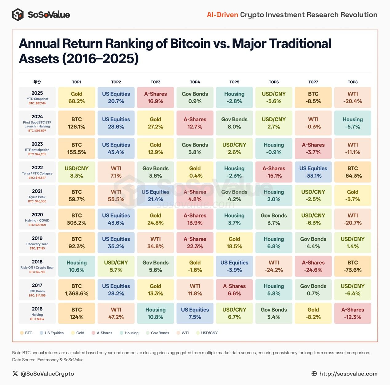 圖10:比特幣與主要傳統資產年度報酬排名比較(2016–2025)(資料來源:SoSoValue,公開資料整理)