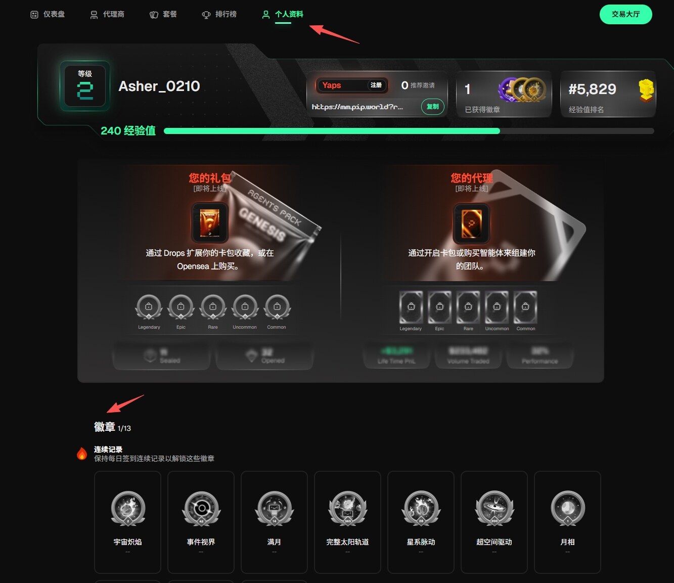 STEP 5. 點擊“個人資料”,下拉頁面可查看徽章解鎖情況,內容包括連續簽到、體驗產品等任務。