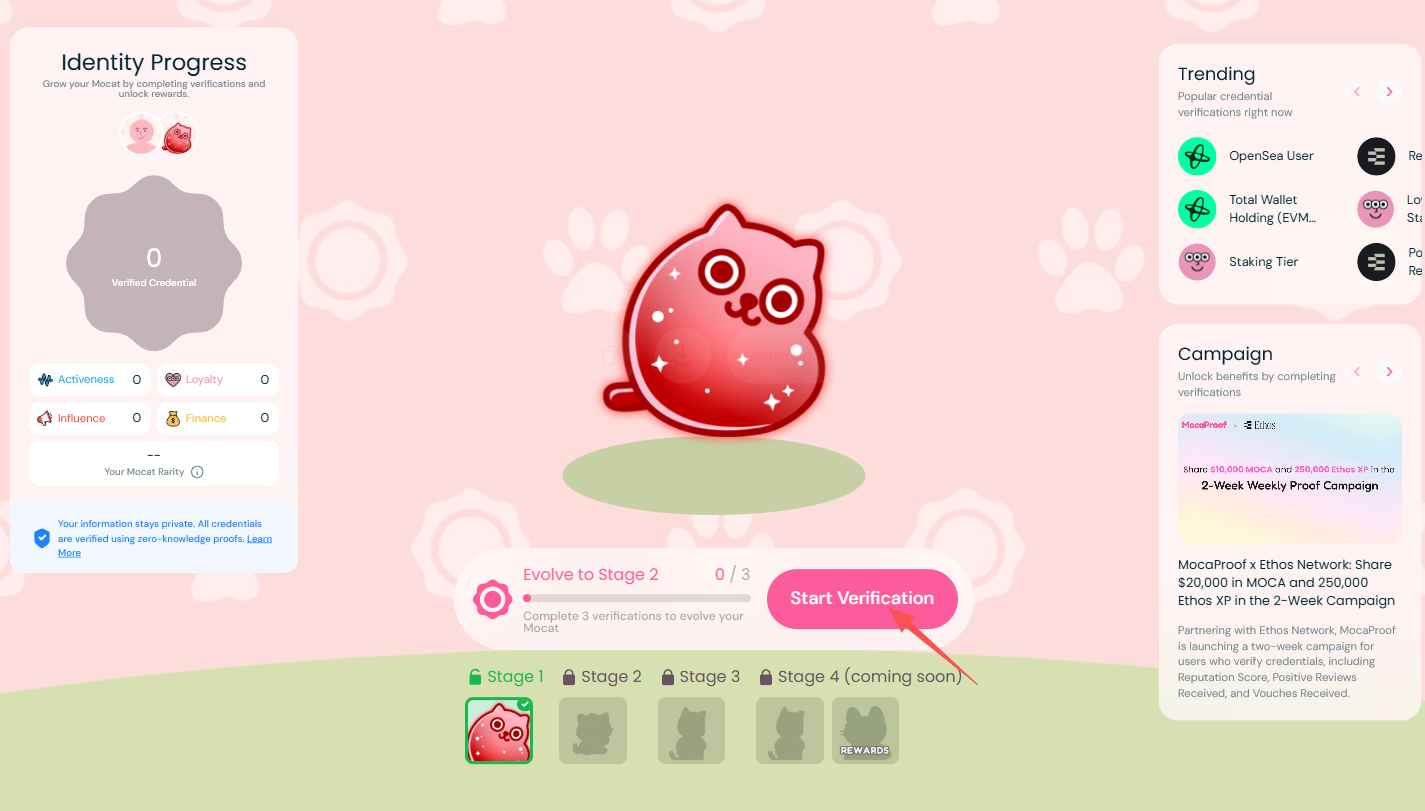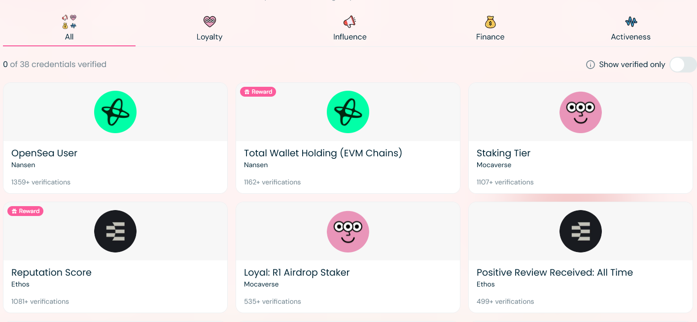 STEP 3. 點選「Start Verification」開始驗證任務,目前可以驗證的任務有:資產與質押相關、藍籌NFT 持有、Opensea 活躍用戶、被Nansen 標記的地址、Ethos 與Cookie3 相關活動地址等。