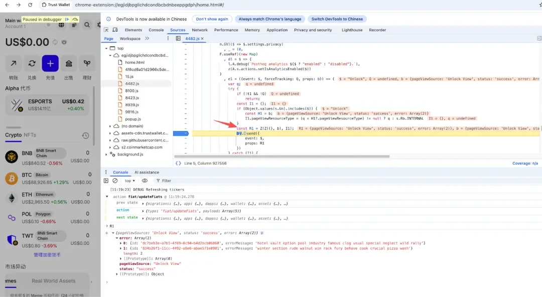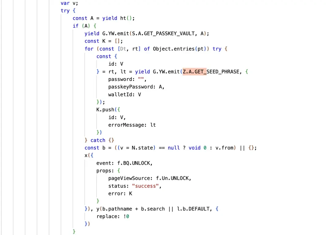 而這個Error 資料的來源是透過GET_SEED_PHRASE 這個函數呼叫獲得的,目前Trust Wallet 支持password 和passkeyPassword 兩種方式進行解鎖,攻擊者在解鎖的時候拿到了password 或passkeyPassword,然後調用GET_SEED_PHRASE 獲取了錢包的助記詞(word 或passkeyPassword,然後調用GET_SEED_PHRASE 獲取了錢包的助記詞(Message 密鑰),然後調用GET_SEED_PHRASE 獲取了錢包的助記詞(Message)。