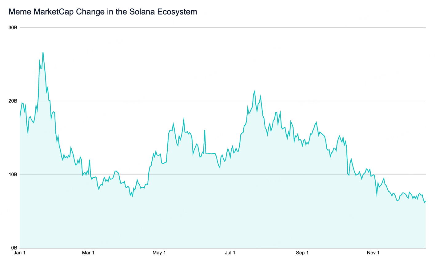 2025年Solana生態的Meme賽道在經歷了年初爆發式增長後逐步降溫,造成這一現象的主要原因是競爭格局變化、內部生態動力不足及缺乏新的Meme敘事週期等多重因素造成。首先,年初AI Agent為Solana Meme賽道帶來大量的了關注度與市值增長,但是隨著加密市場的整體回調相關的Meme資產市值迅速下跌,導致Solana Meme市值從高點回調超過50%。此後年中時Solana生態曾因Pumpfun發幣以及Bonkfun的崛起重獲一輪熱度,帶動鏈上Meme交易量與參與度短暫回升,但這波熱潮缺乏延續性。