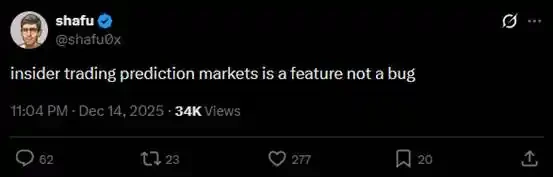 這樣的觀點有一定的道理,但我想預測市場平台方們本身會抗拒這樣的定位,因為長遠來看這會傷害散戶的信任,整個市場實質上從一個鼓勵貢獻個人研究與洞察、匯聚群體智慧的博弈平台變成了內幕信息者單方面的“屠殺”,不利於流動性的發展。如果預測市場是這樣的,那不如改名為「資訊懸賞平台」。