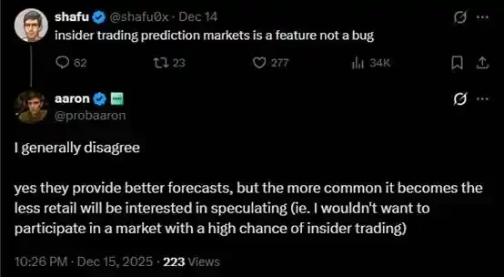 Kalshinomics 創始人@probaaron 就對@shafu0x 的觀點進行了反駁,「我通常不同意這種說法。沒錯,它們確實能提供更準確的預測,但隨著它們越來越普遍,散戶對投機的興趣就會降低(例如,我不想參與一個內幕交易可能性很高的市場)。」