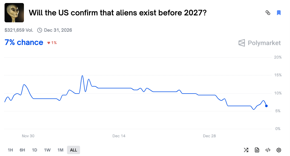 - 事件合約連結:https://polymarket.com/event/will-the-us-confirm-that-aliens-exist-before-2027?tid=1767610632144