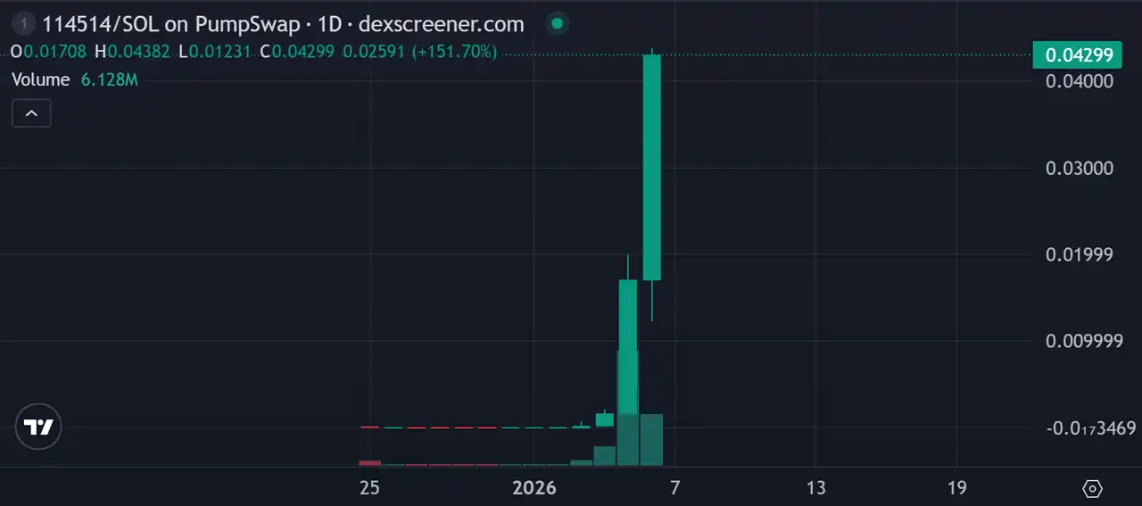 meme 行情的回暖讓注意力的輪動切換也重新變得快速了起來。White Whale 的成功也才一週多時間,而且現在價格仍然維持在歷史最高點附近,但這兩天又新出了一個名為「114514」的新金狗,就在今天剛剛突破 4000 萬美元市值創下歷史新高,2 天漲了約 250 倍。