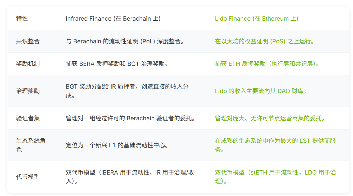 雖然流動性質押不是一個新概念,但 Infrared 與 Berachain 的原生整合賦予了它獨特的優勢。讓我們將其與像以太坊上的 Lido 這樣的知名協議進行比較。