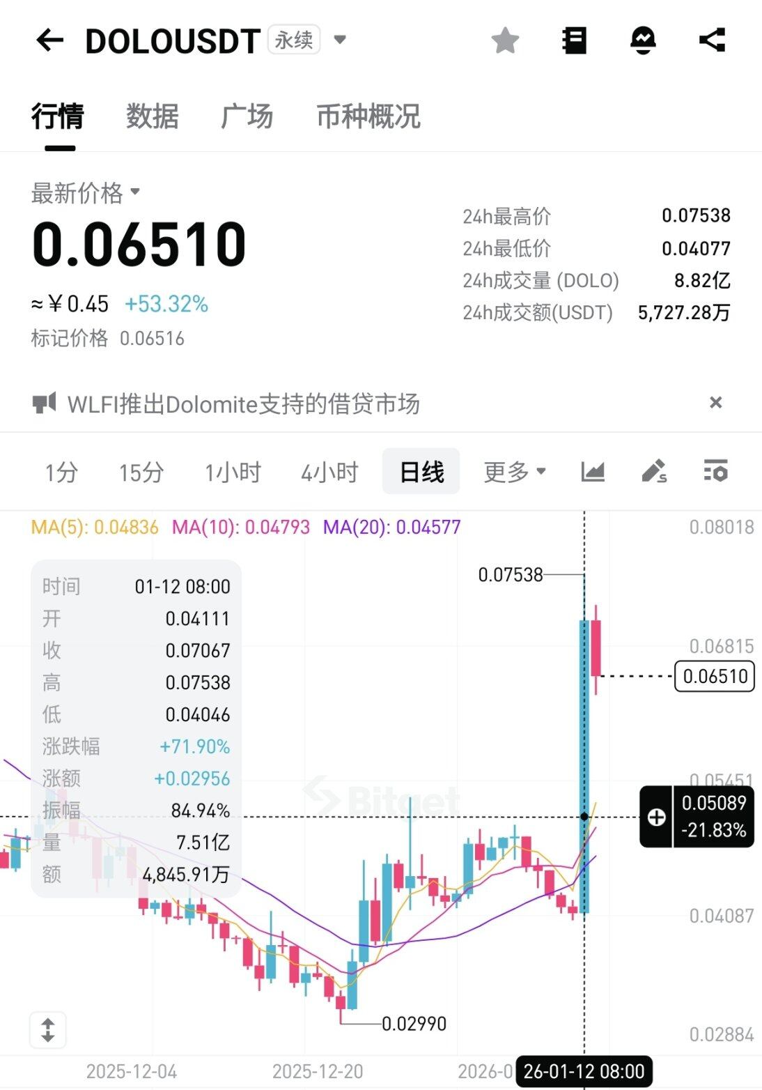 平台發布後立刻引發市場反饋。作為底層協議架構提供方的 Dolomite,其原生代幣 DOLO 當日收漲 71.9%。