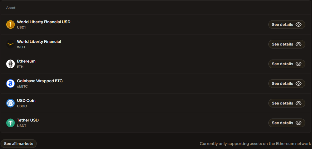 WLFI Markets 目前支援的幣種 | 圖源:WLFI 官網