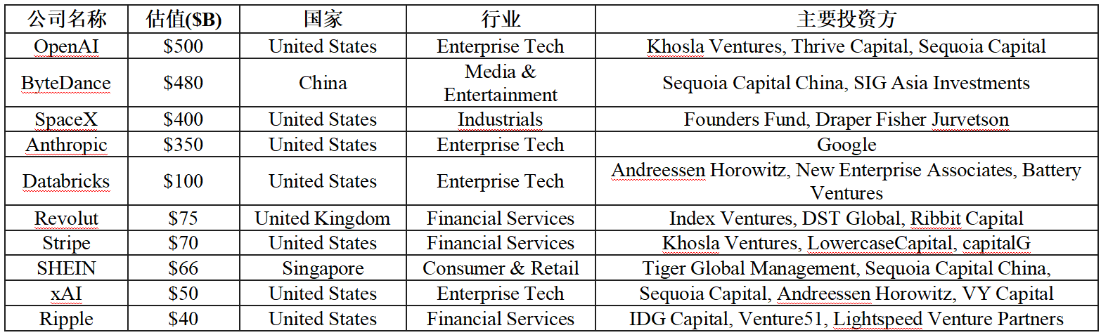 而從「資產估值體量」來看,僅獨角獸群體估值就達到萬億級。胡潤研究院[3]統計結果,截止 2025 年中期此數據為 5.6 萬億美元。另據 CB Insights 統計,截至 2025 年 7 月全球 1,289 家獨角獸累計估值超過 4.8 萬億美元。[4] 具體全球 Top10 獨角獸企業估值及行業介紹如表 3 所示。
