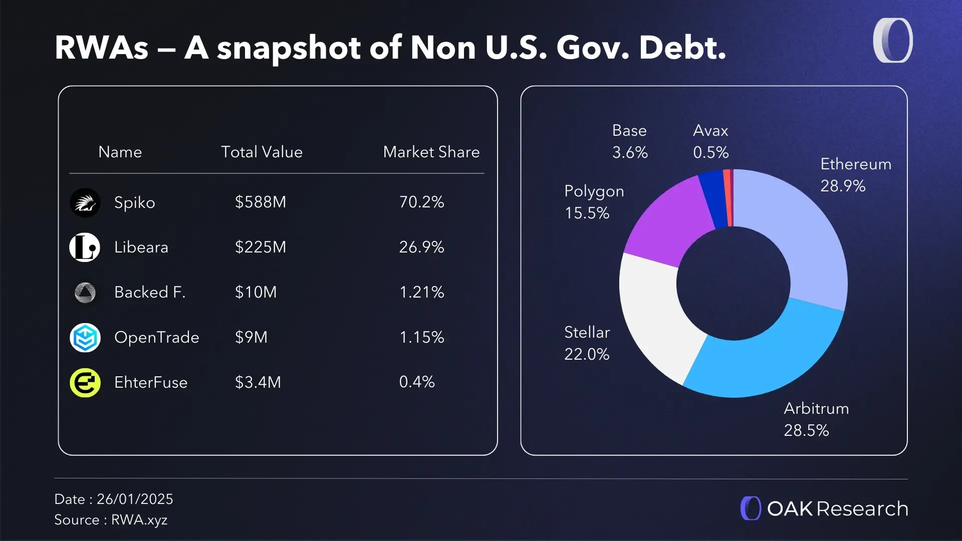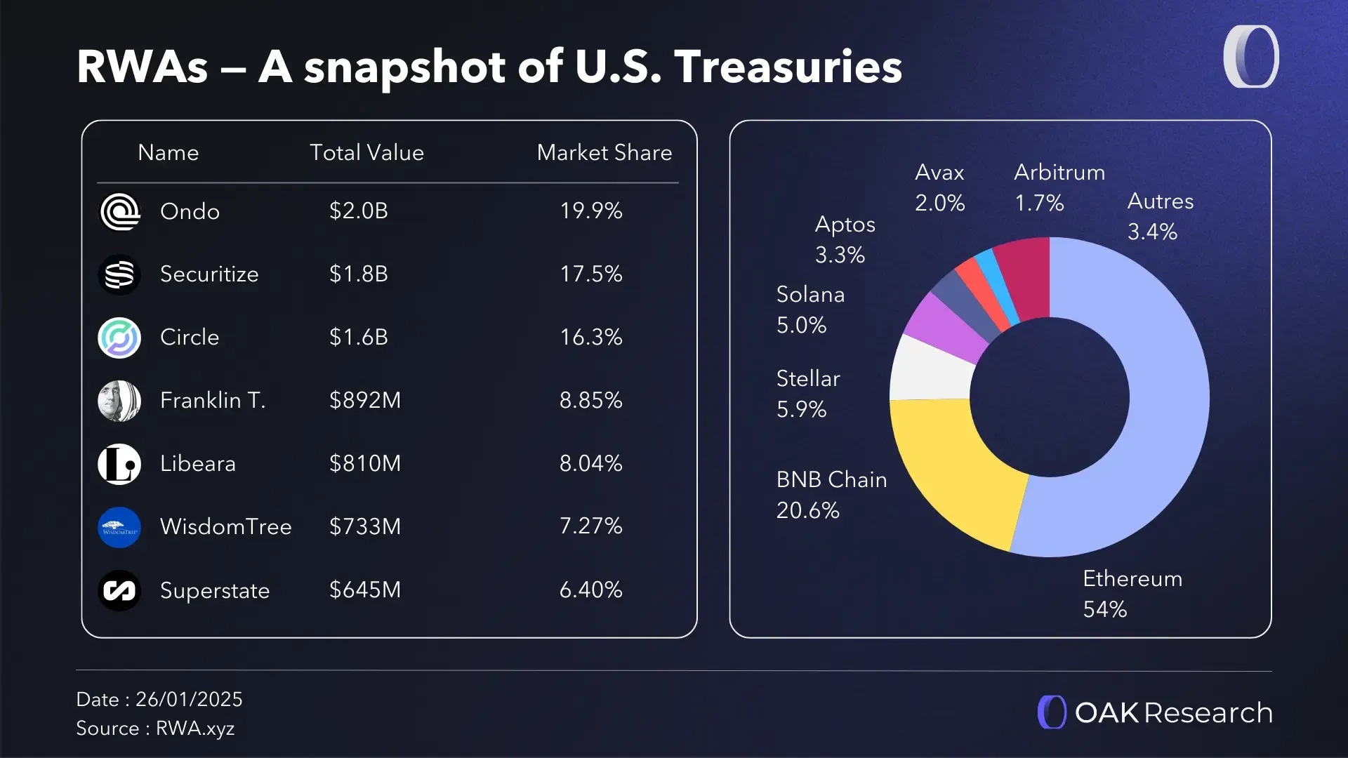 - Securitize 是目前最核心的代幣化服務提供商,儘管 WisdomTree、Franklin Templeton 和 Centrifuge 近年增長同樣顯著。