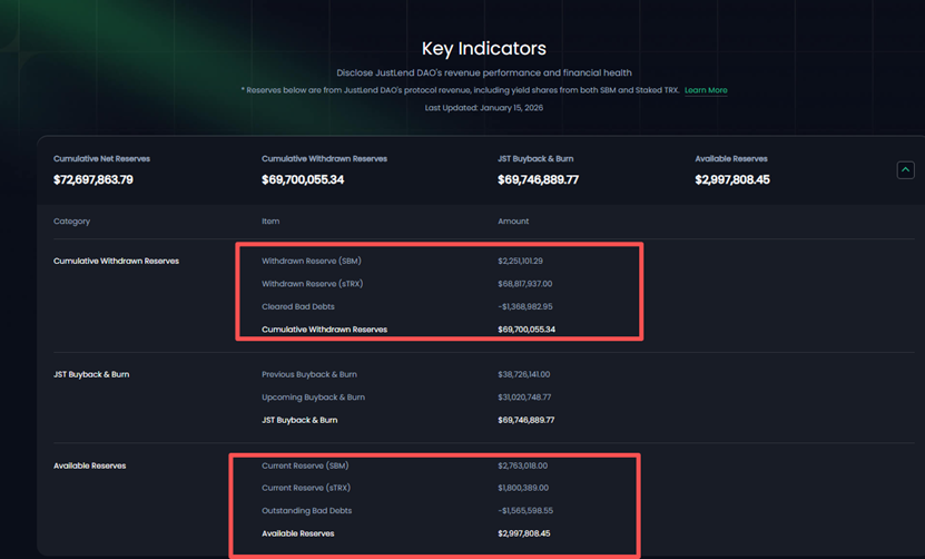 從收益數據來看,根據Transparency頁面顯示,JustLend DAO累計淨收益已高達7269萬美元。2025 年第四季度從協議中累計提取儲備收益 6970 萬美元,其中 sTRX 板塊提取存量收益超 6881 萬美元,SBM 板塊提取 225 萬美元;目前,JustLend DAO平台剩餘的收益儲備約299萬美元,其中sTRX中可用儲備180萬美元。