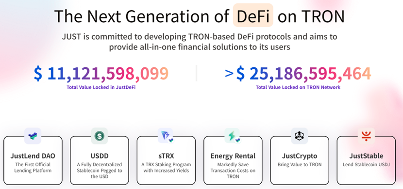 JST代幣的價值根基在於其背後的JUST生態。作為波場TRON生態內的一站式DeFi解決方案,JUST已建立起一個完整且成熟的DeFi生態系統,囊括核心借貸協議JustLend DAO、去中心化穩定幣USDD、質押產品sTRX、能量租賃Energy Rental及跨鏈產品JustCrypto等多元鏈上金融工具,能夠一站式滿足用戶從資產增值到靈活配置的全場景需求。根據1月28日官方最新數據,波場TRON全網總鎖倉價值(TVL)已達251億美元,其中JUST生態TVL為111億美元,佔比44%,穩居波場TRON生態的核心地位。