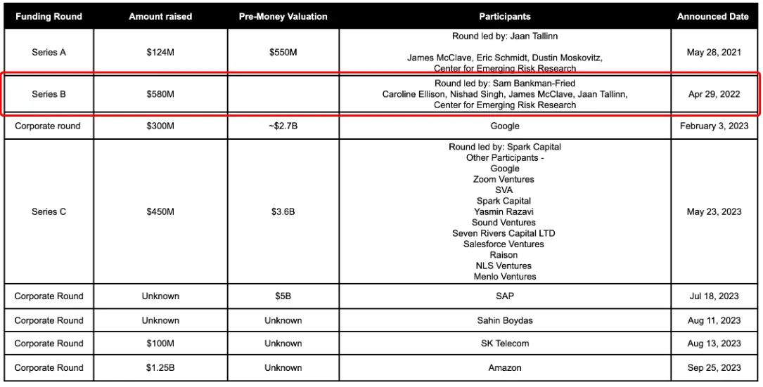 2022 年 4 月(此為官宣日期,交易實際完成於 2021 年),FTX 完成了在 AI 領域最重要的一筆投資 —— 出資 5 億美元領投了 AI 創企 Anthropic 的 5.8 億美元融資,股權佔比一度高達 13.56%,之後隨著 Anthropic 陸續完成多輪融資而稀釋至 7.84%。