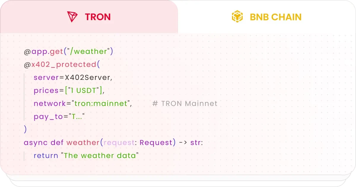 - 已深度整合波場TRON和BNB Chain,利用波場TRON高流通量、低成本的USDT支付網絡,天然契合AI Agent高頻、小額的微支付需求。