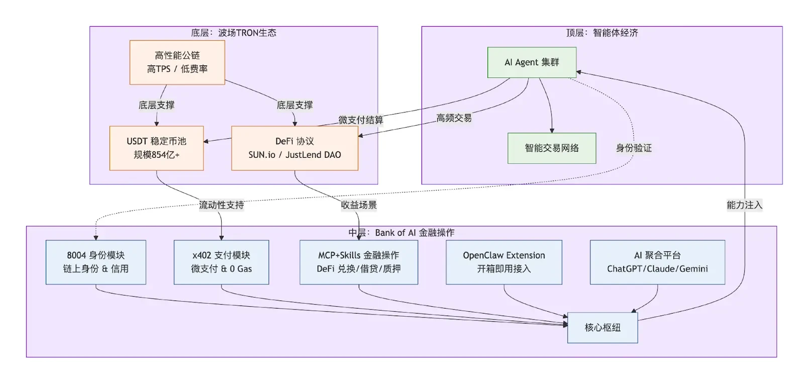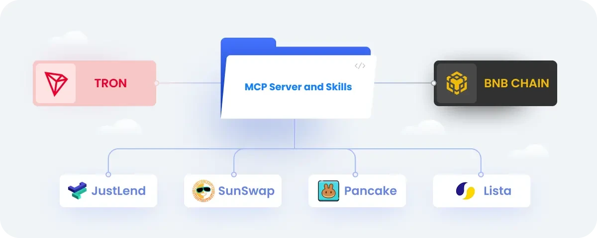 - 金融操作模組通過MCP協議和Skills技能庫,讓AI Agent能無縫調用如SUN.io、JustLend DAO等DeFi協議進行資產配置與增值。