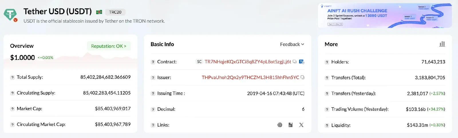 從這個維度審視,波場TRON的價值便清晰浮現。作為全球最活躍的穩定幣流通網絡,它承載著加密支付的真實脈搏。據TRONSCAN數據顯示,波場TRON鏈上流通的 USDT 規模已超854億,佔據了全球穩定幣市場的半壁江山,對於人類用戶而言,這可能只是意味著轉帳便宜。但對於 AI Agent 而言,這構成了生存的基礎。AI Agent支付具有高頻、小額、7x24 小時不間斷的特徵,而波場TRON的USDT支付基礎以及低廉的手續費和極高的吞吐量(TPS),天然契合 AI Agent的微支付場景,足以支持AI Agent在金融領域的規模化應用。